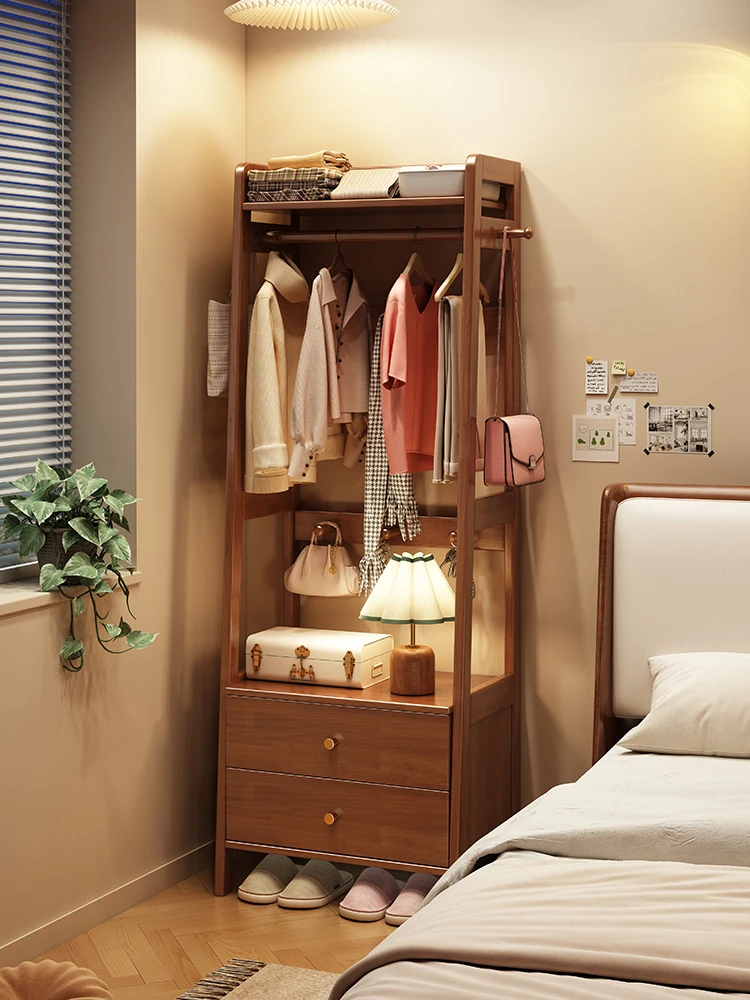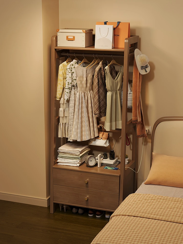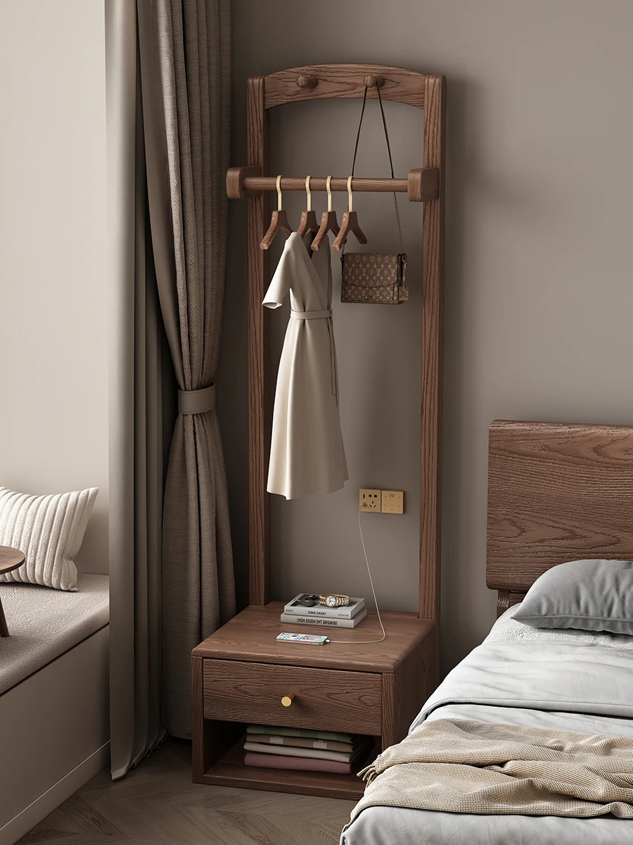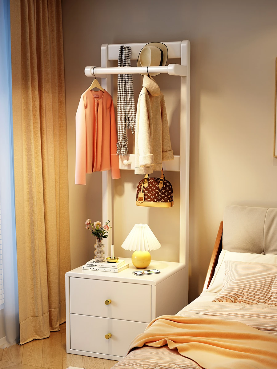 天然木製ベッドサイドキャビネット&ハンガーラック一体型─コンパクトな寝室にピッタリ!省スペースで便利な収納付きのスタンド式コートハンガー
