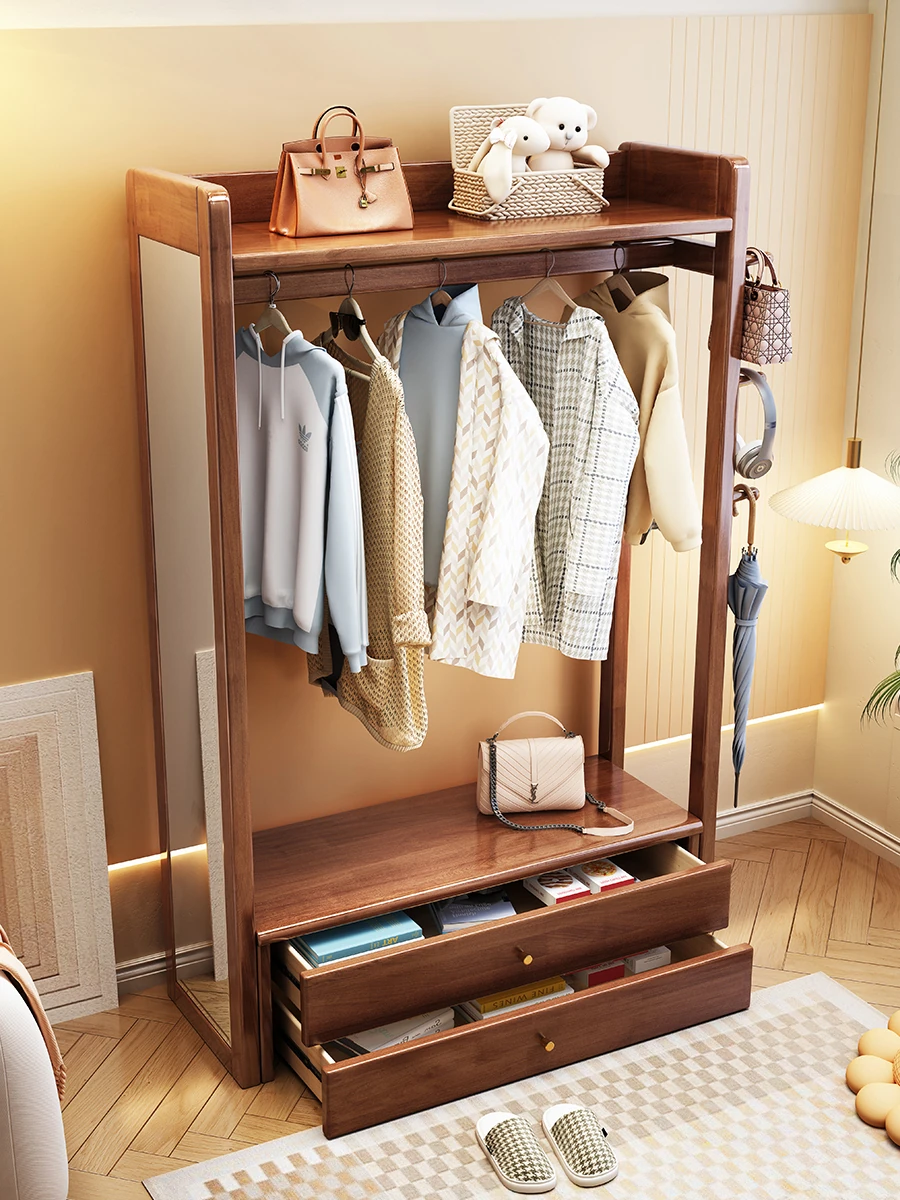 ナチュラルウッド製シンプルモダン衣帽子掛け|全身ミラー付きおしゃれ収納スタンド|ベッドルームにおすすめの洋服ラック