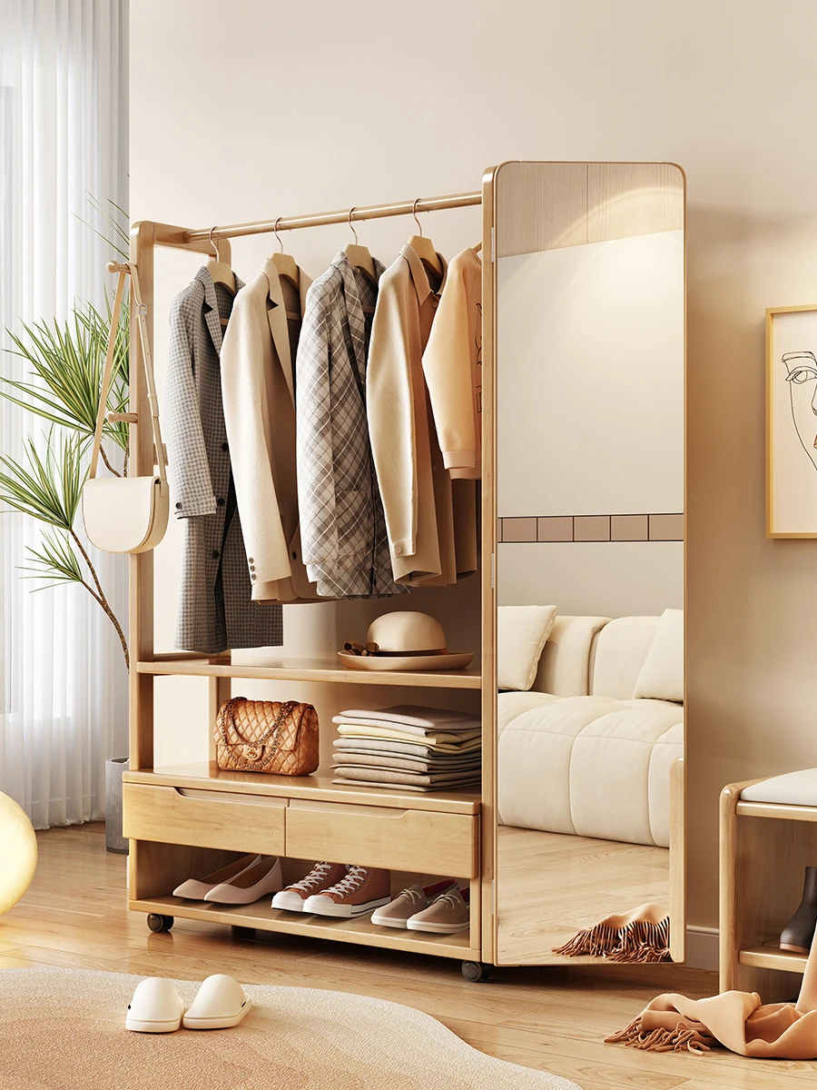 天然木製スタンドミラー付き収納キャビネット衣類ラック - おしゃれで実用的!リビングや寝室に最適な落ち着きのあるデザインで、ファッションも整理もこれ一本!