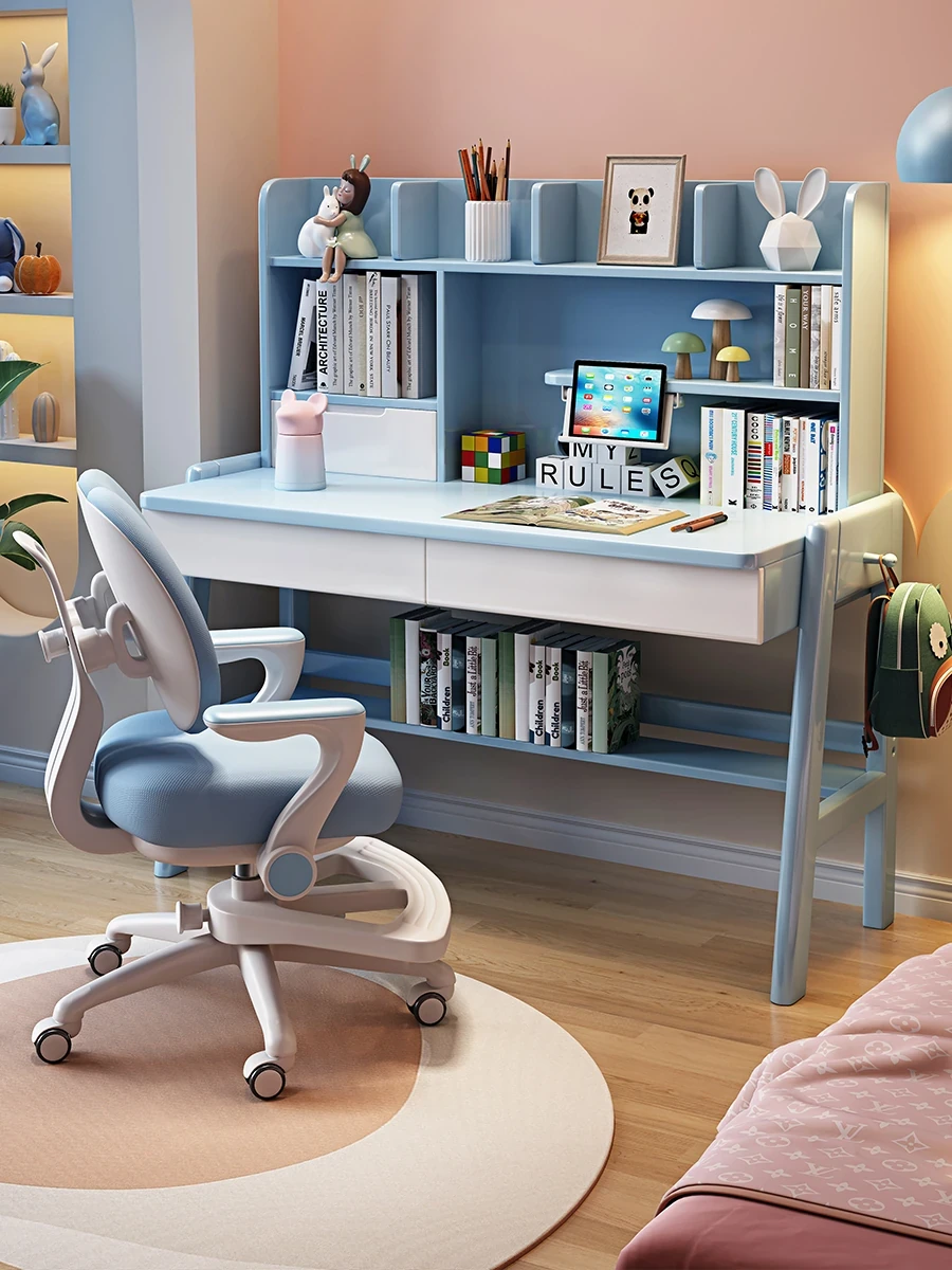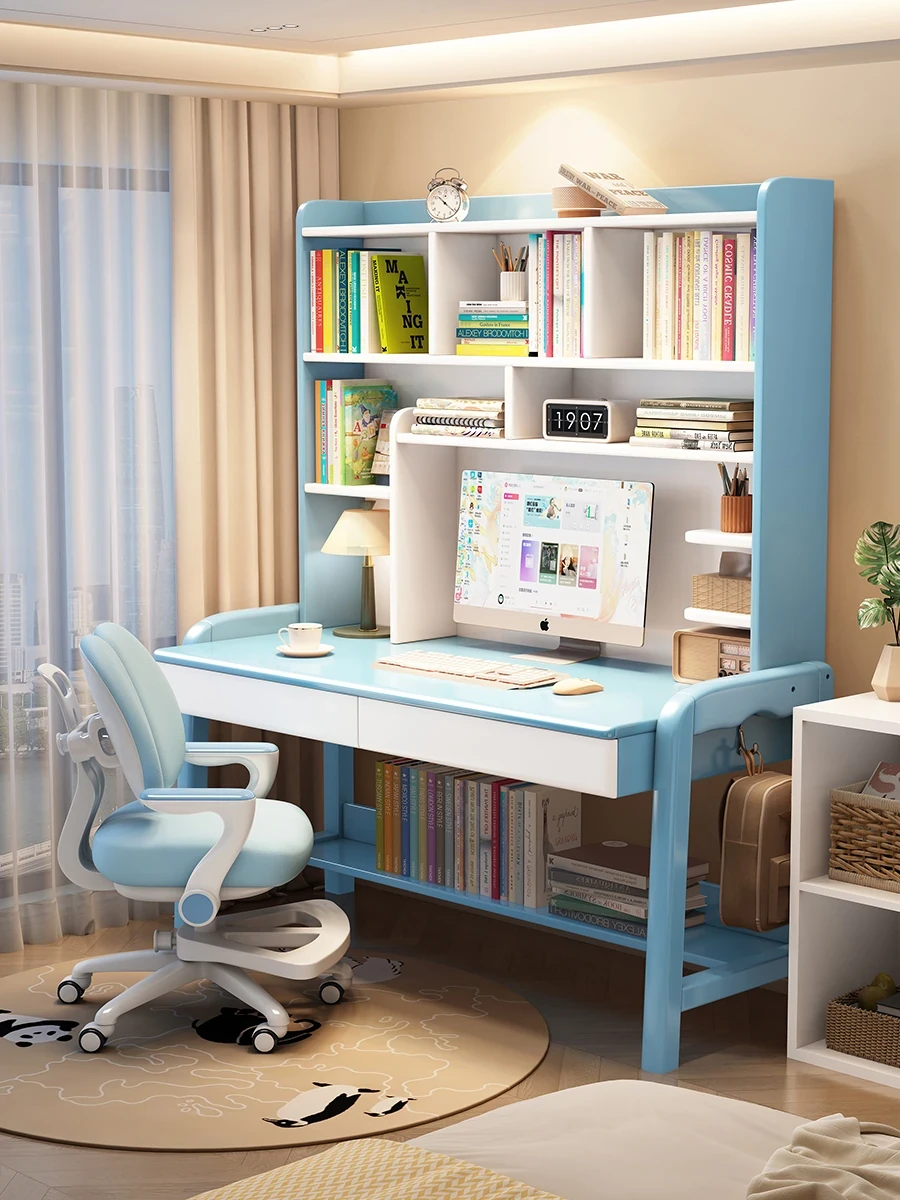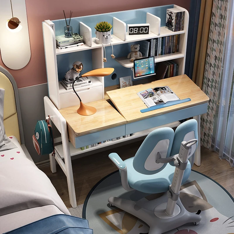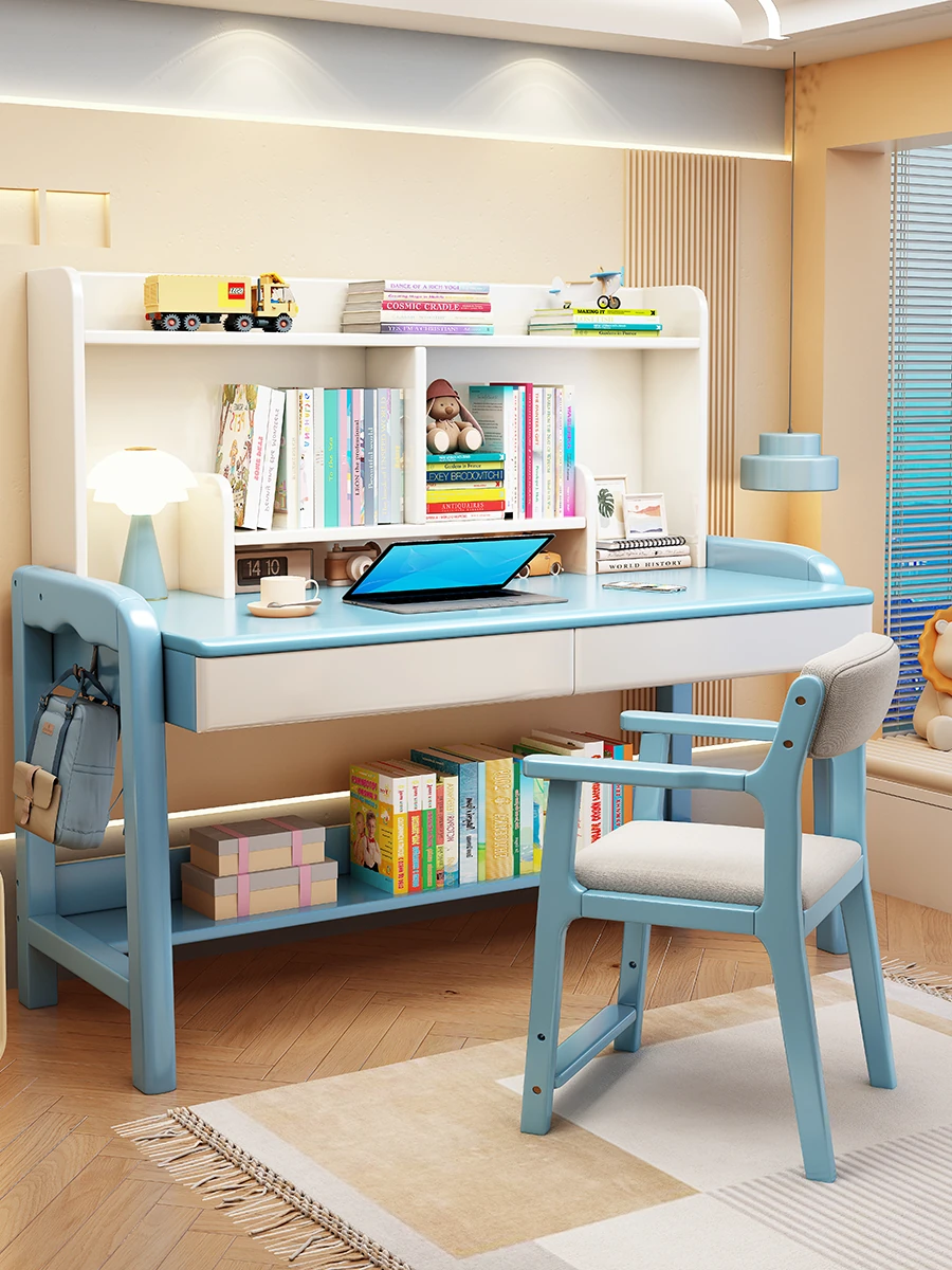 子供用木製学習デスクセット - 丈夫で安全、大容量の本棚付き!家庭用・学生用・書斎・寝室にピッタリな多機能パソコンデスク。
