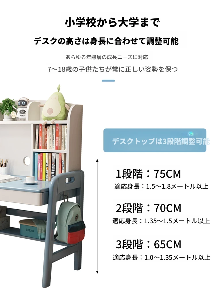 子供用学習デスク&本棚一体型スタディセット-調整可能な高さで成長にフィット!小中学生向け天然木材使用、自宅の勉強時間をもっと快適に。シンプルで機能的なデザイン。