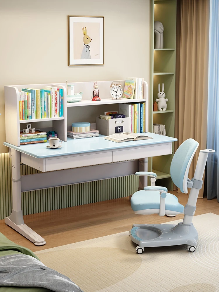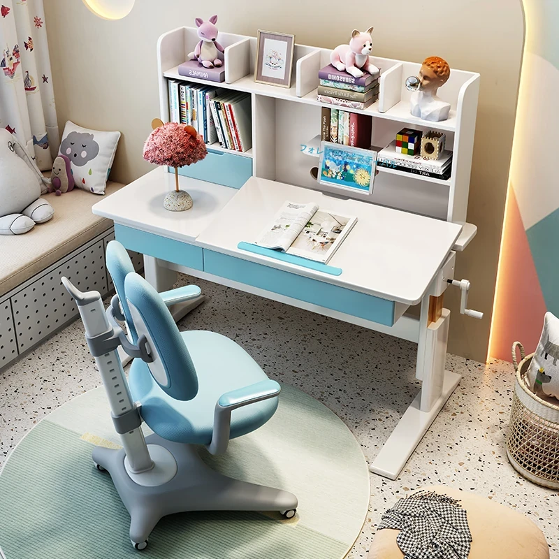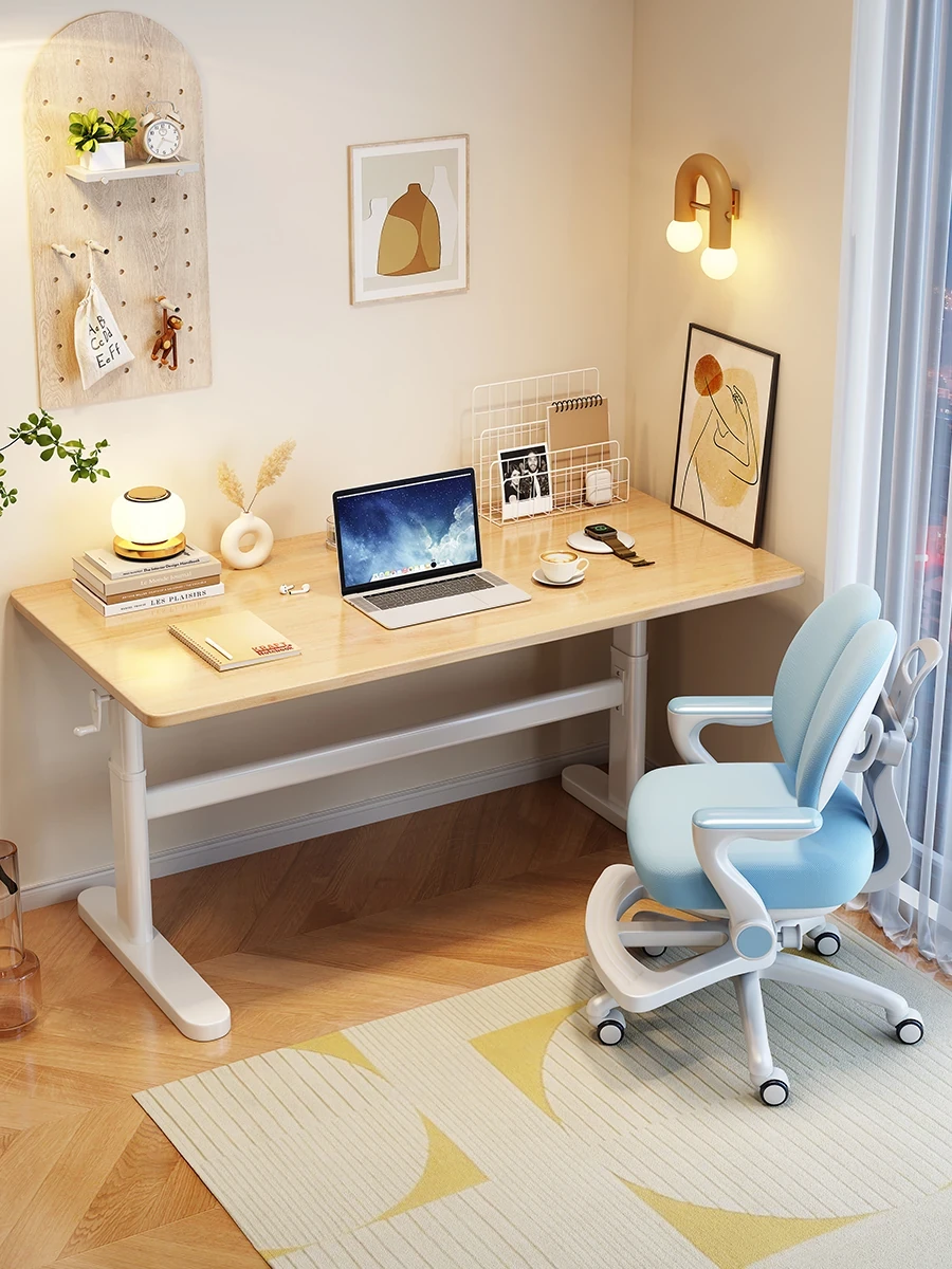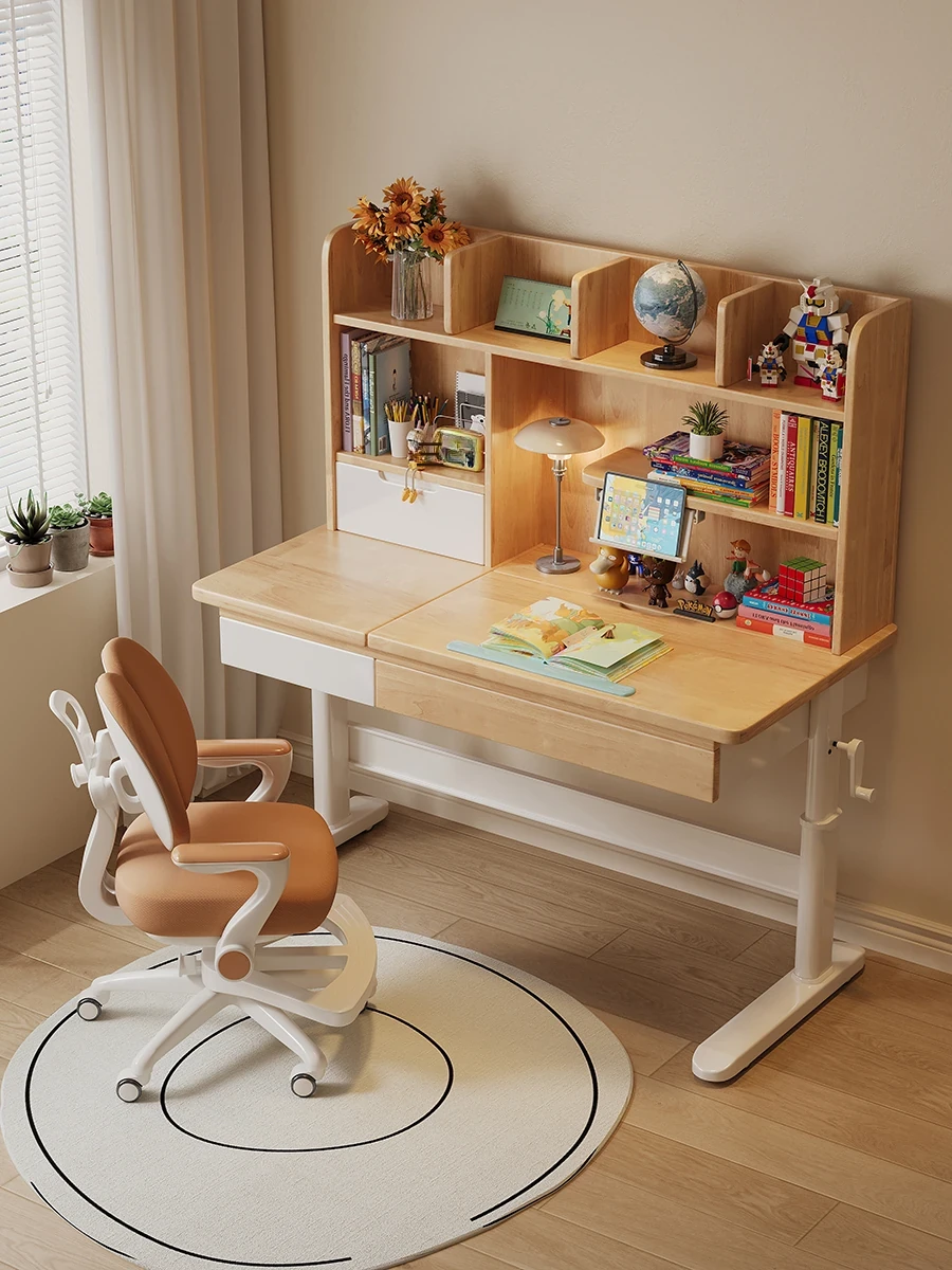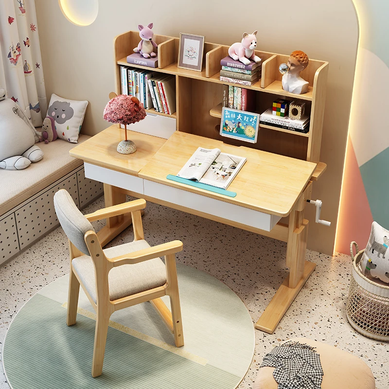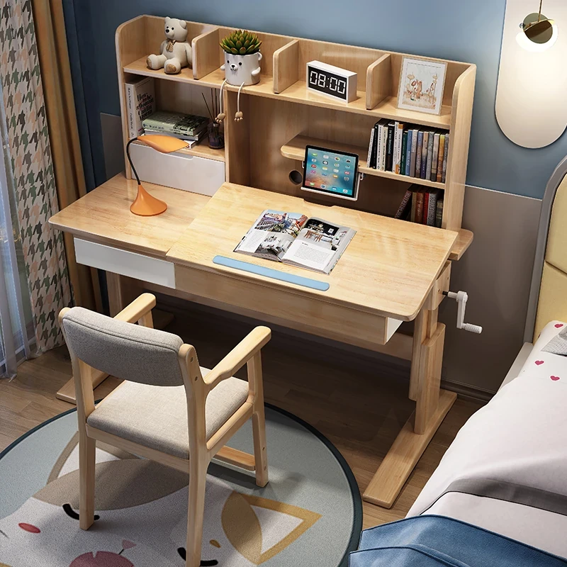 子供用学習机:シンプルでモダンなデザインの天然木製デスク!自宅のベッドルームに最適、手動昇降機能付きで成長に合わせて使える小学生セット。