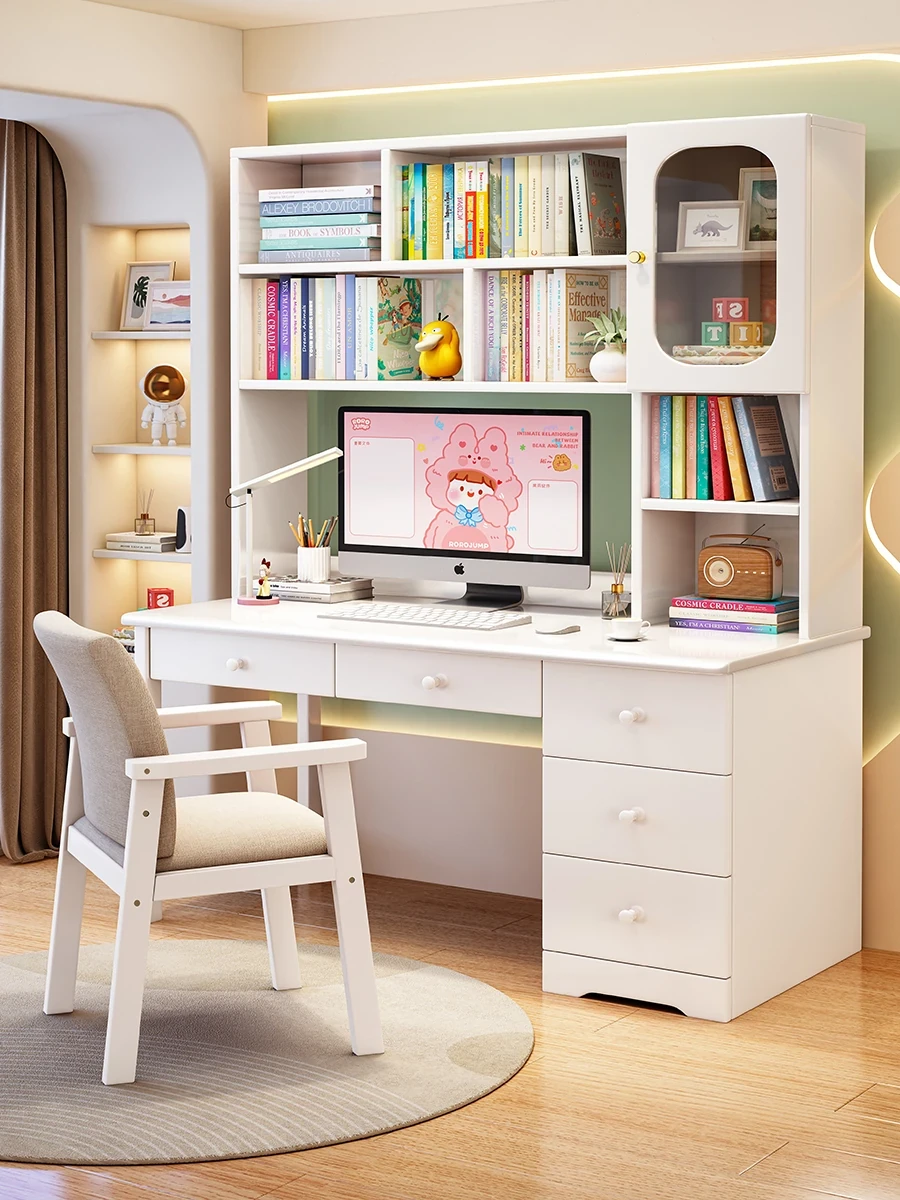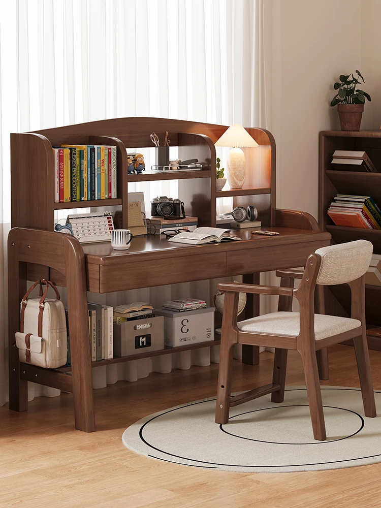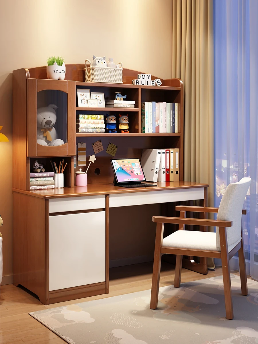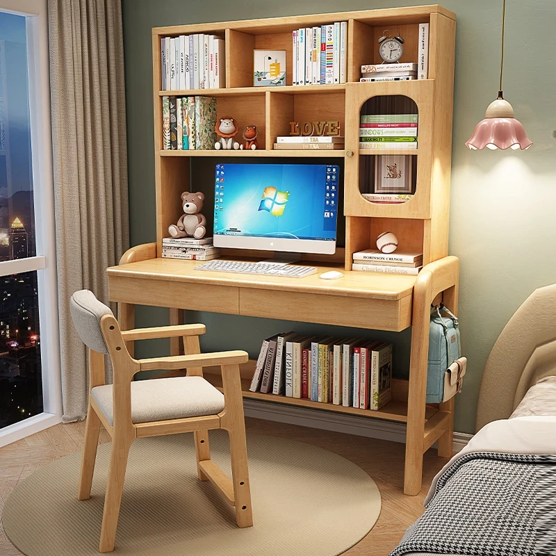 シンプルで美しい!本棚一体型天然木製デスク - 寝室にぴったり!家用オフィス用PCデスク&子供学習机