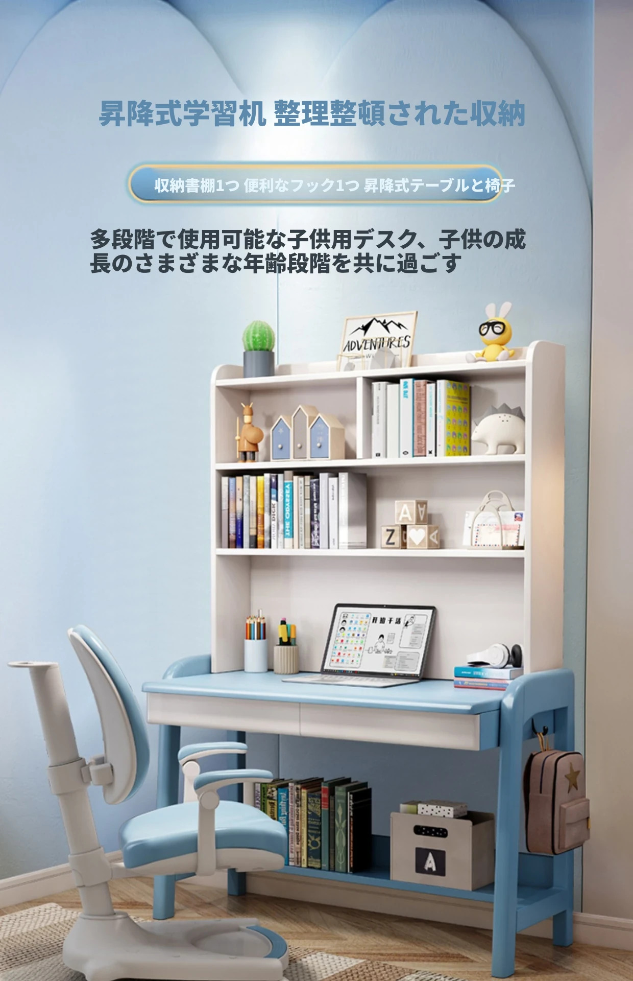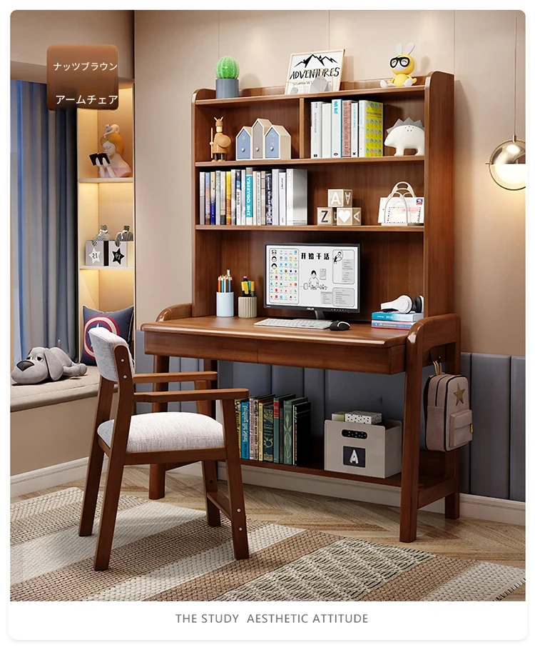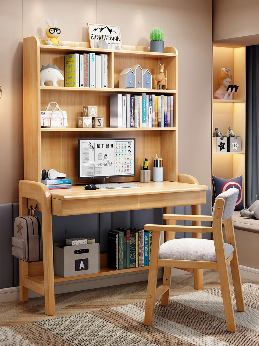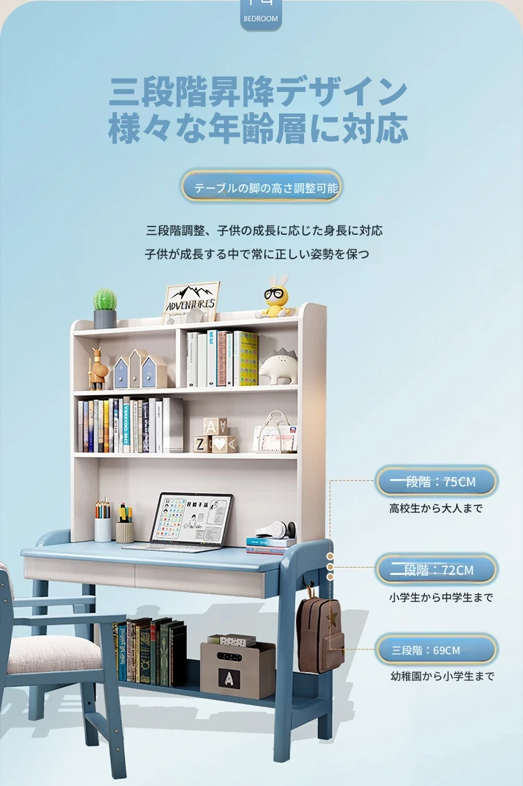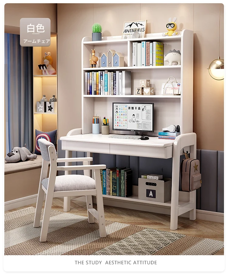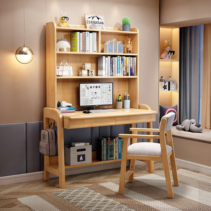 【魅力挑战!】天然木材一体型書棚付きデスクセット:学生用可昇降式多機能PCデスク【家庭の寝室に最適!】子供のための学習・書き物デスク