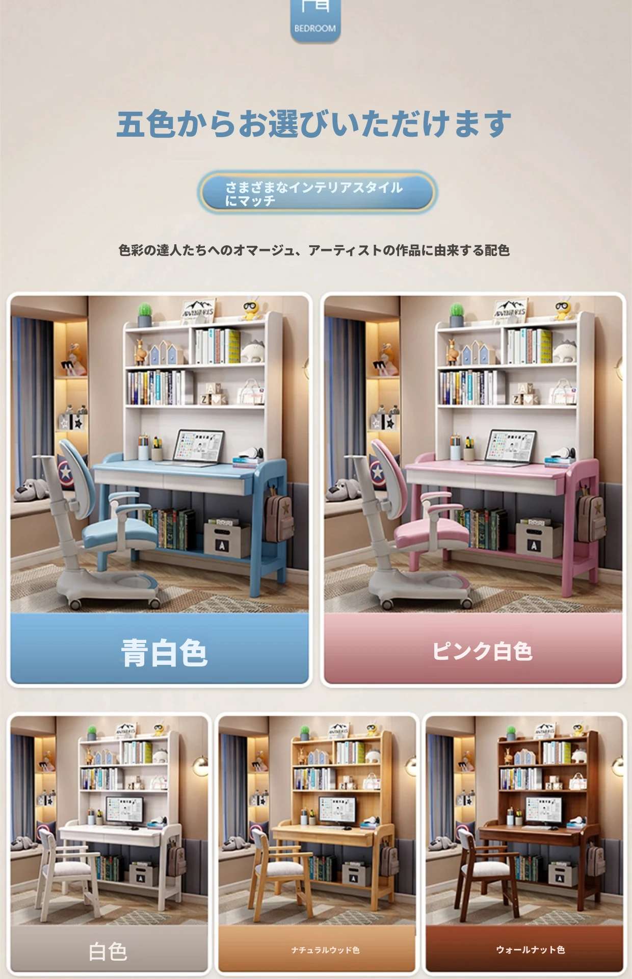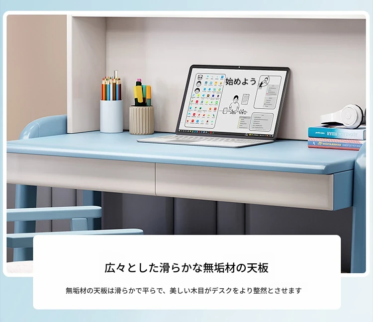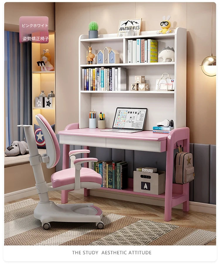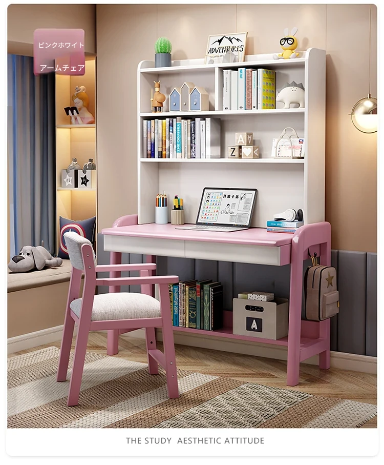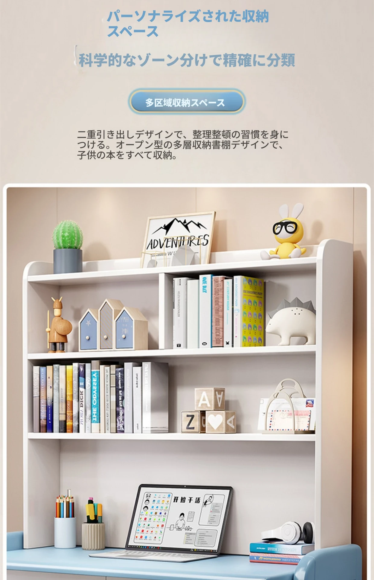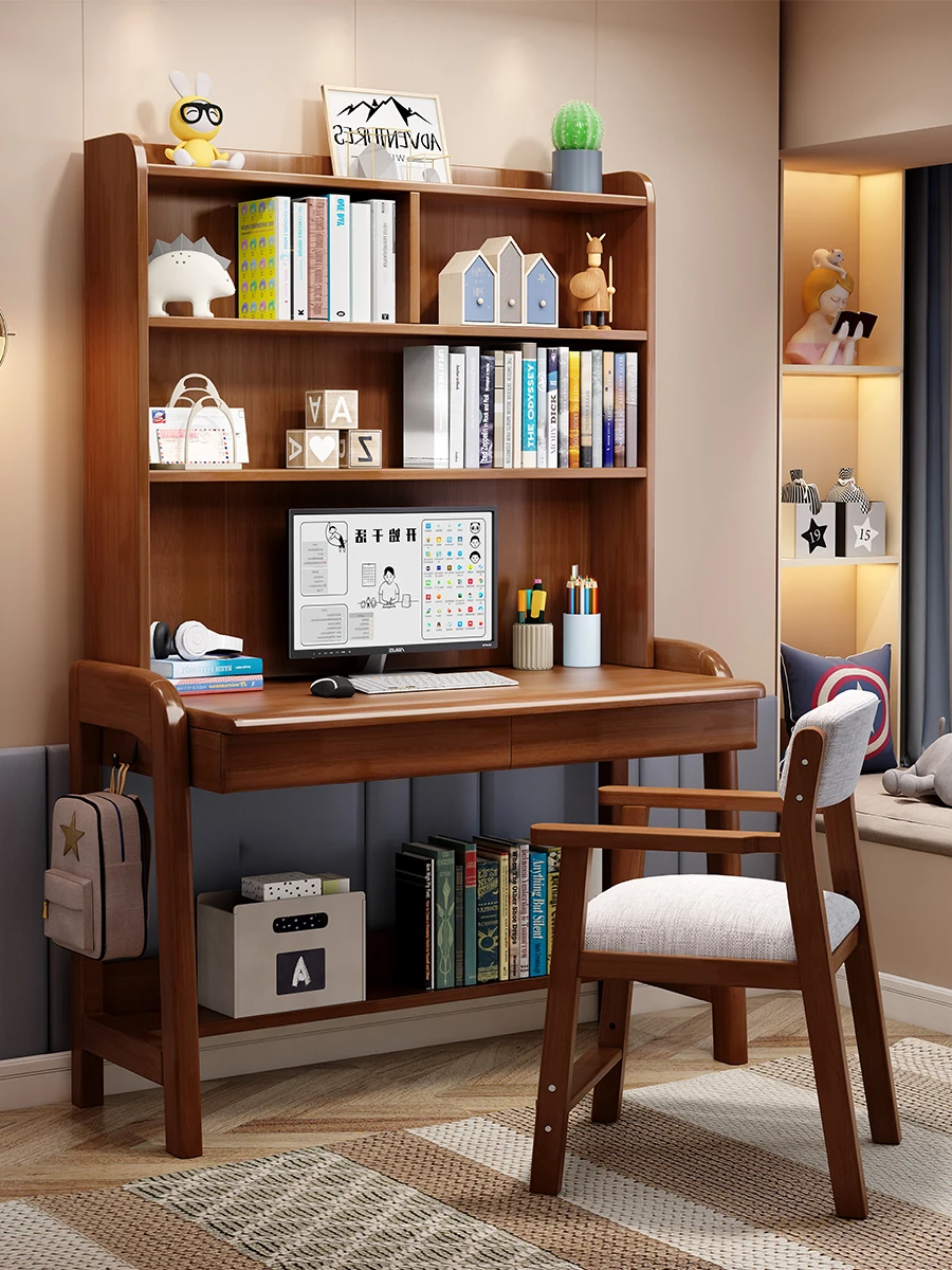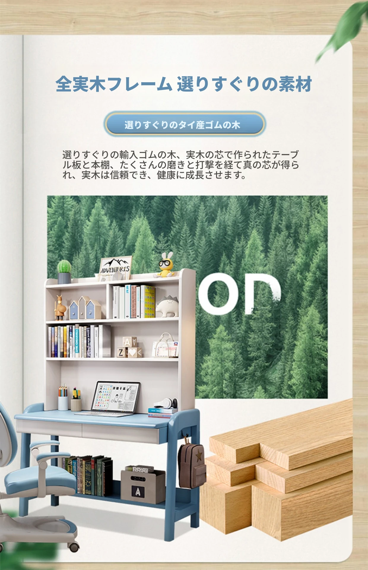 【魅力挑战!】天然木材一体型書棚付きデスクセット:学生用可昇降式多機能PCデスク【家庭の寝室に最適!】子供のための学習・書き物デスク