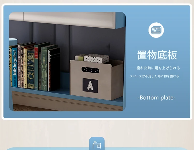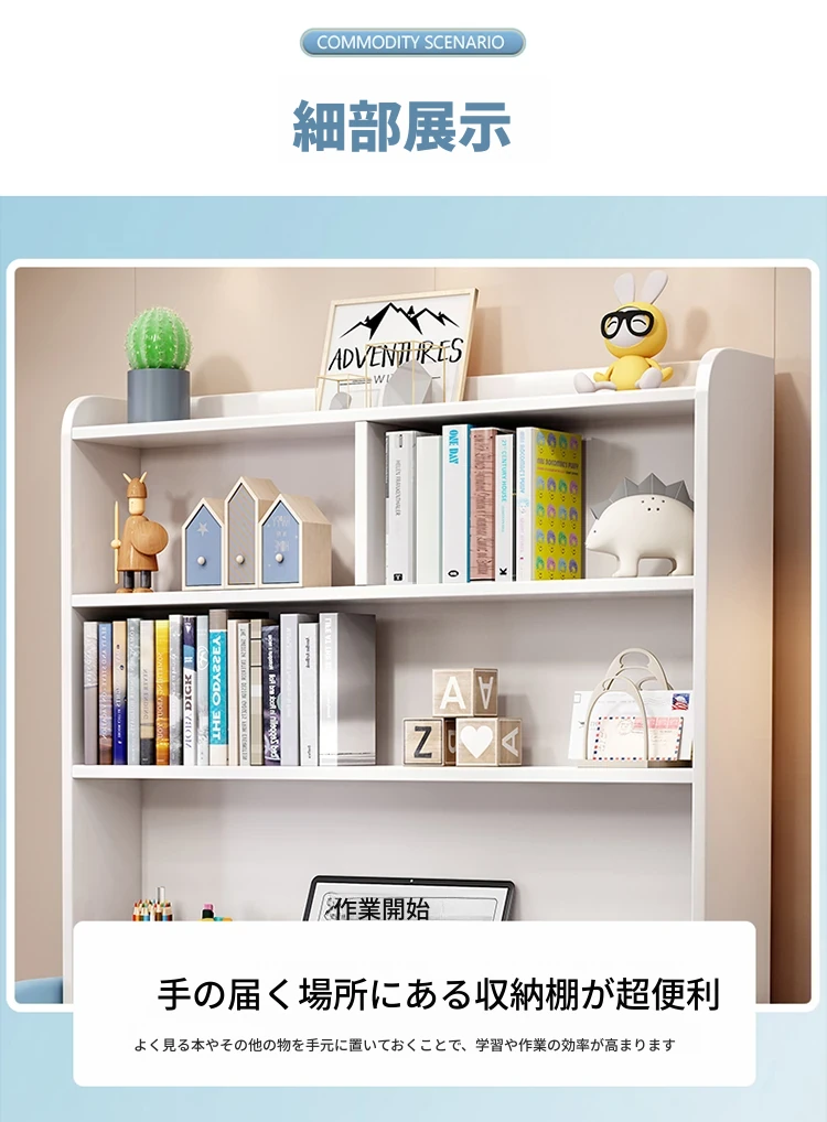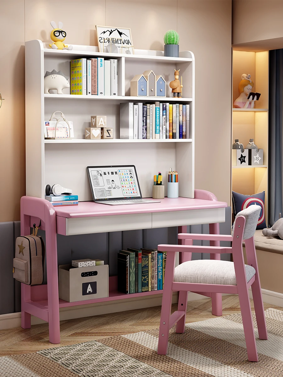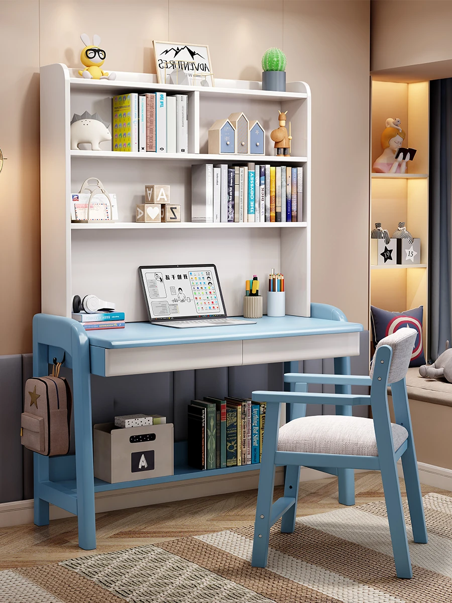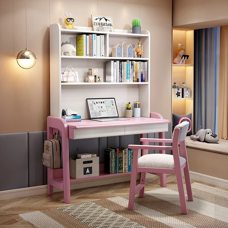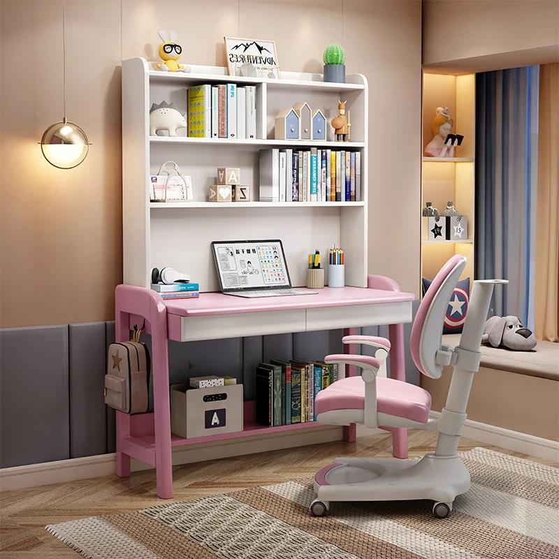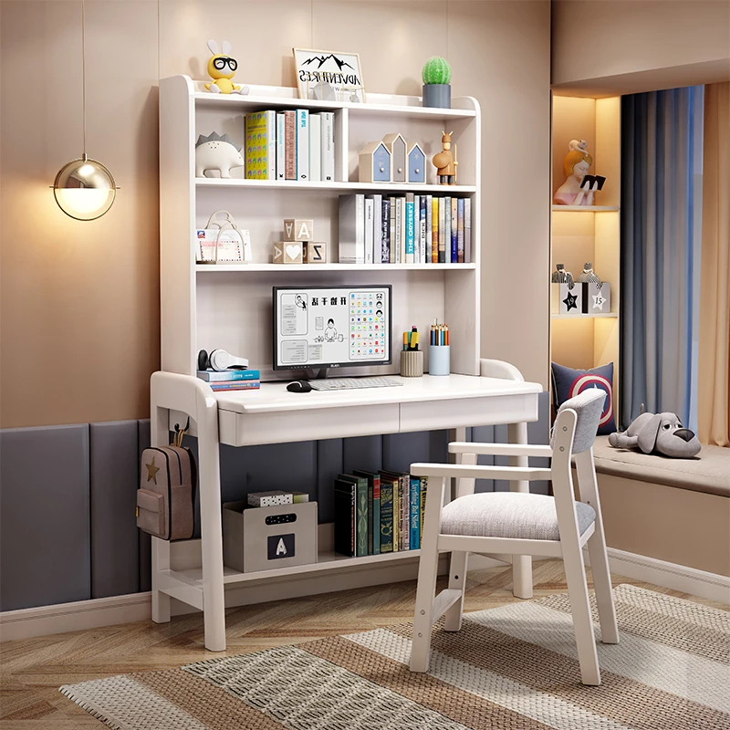 【魅力挑战!】天然木材一体型書棚付きデスクセット:学生用可昇降式多機能PCデスク【家庭の寝室に最適!】子供のための学習・書き物デスク