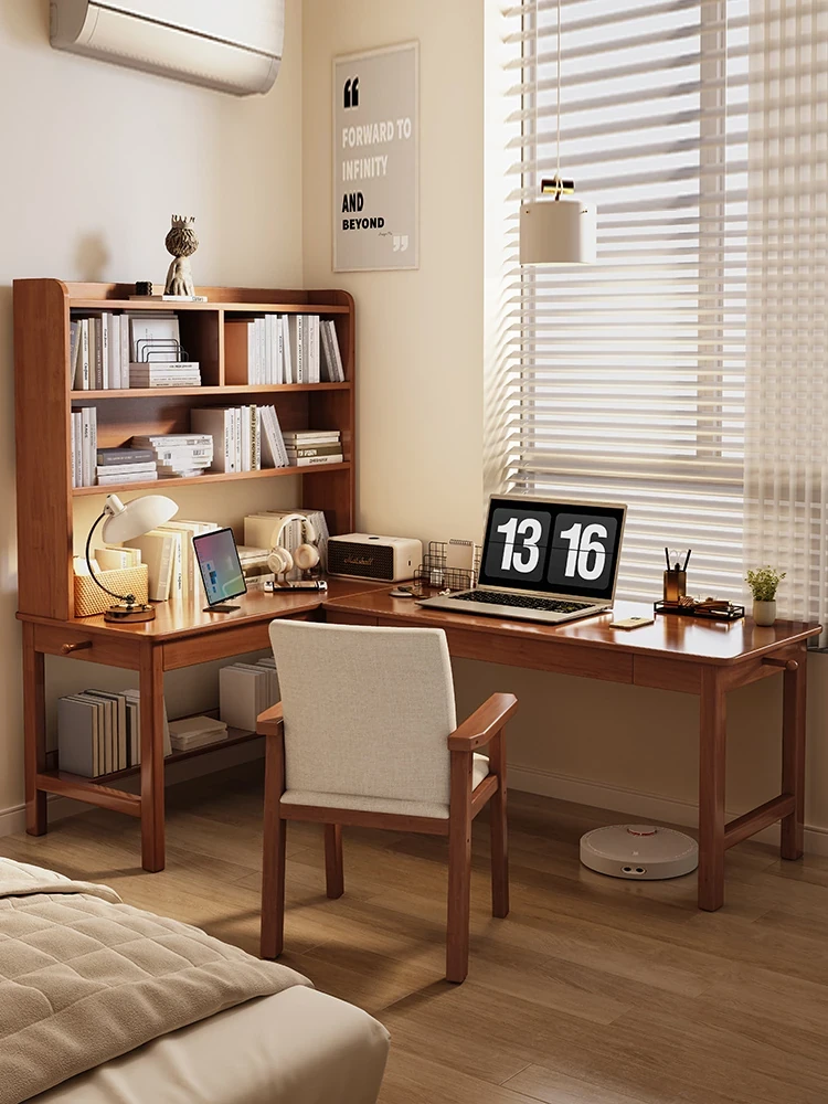 【家庭用】天然木製シンプルデザインL字型デスク&シェルフ一体型スタイル - スペースを有効活用するコーナー家具、寝室や書斎に最適なPCデスク